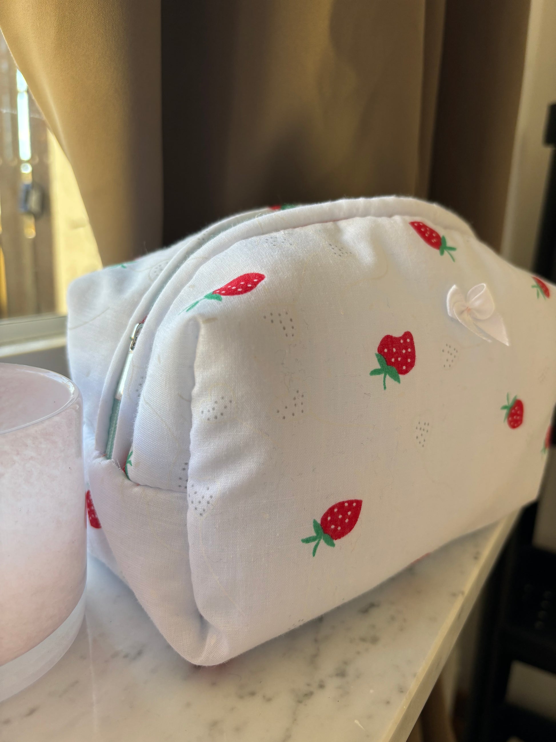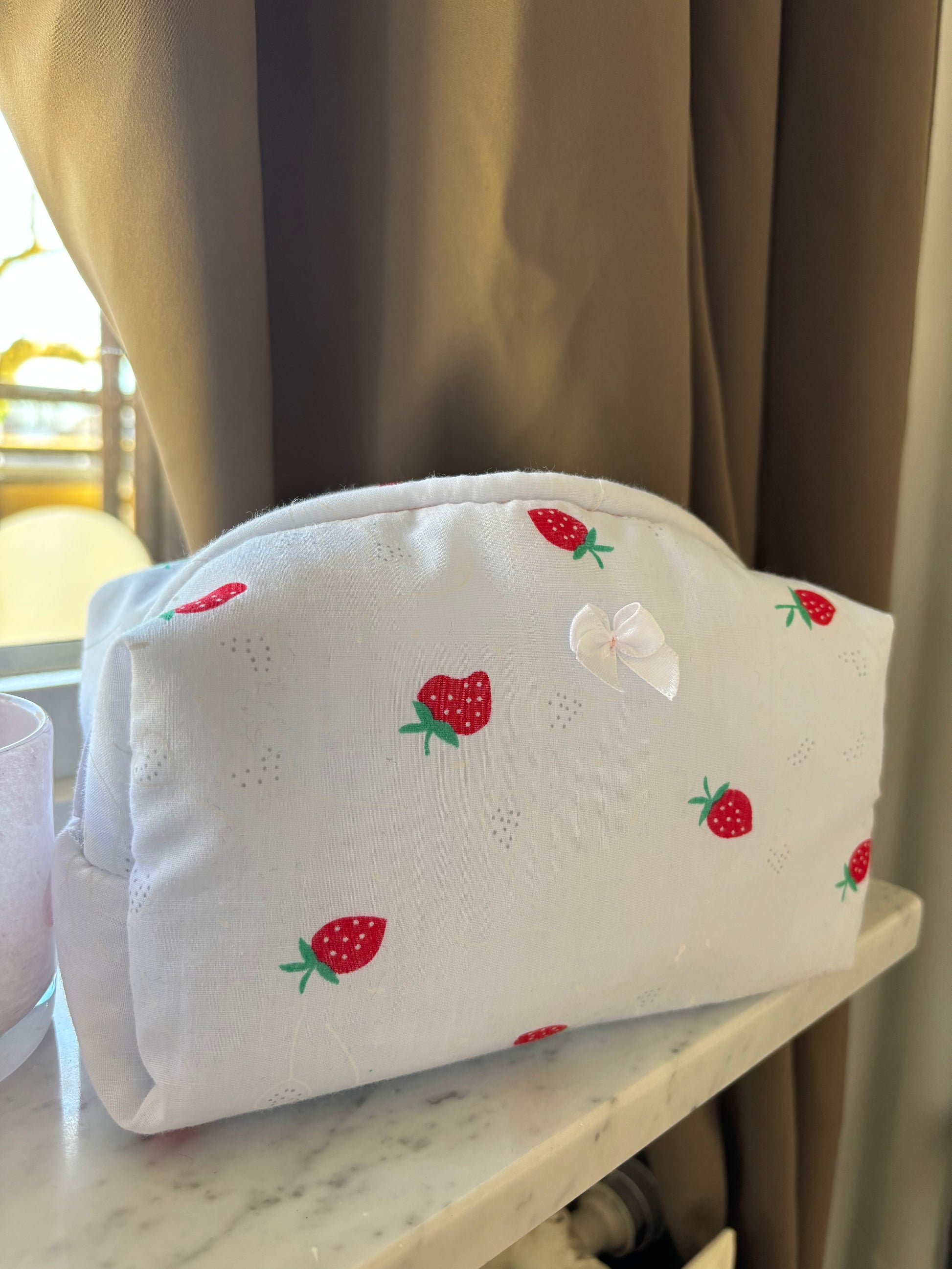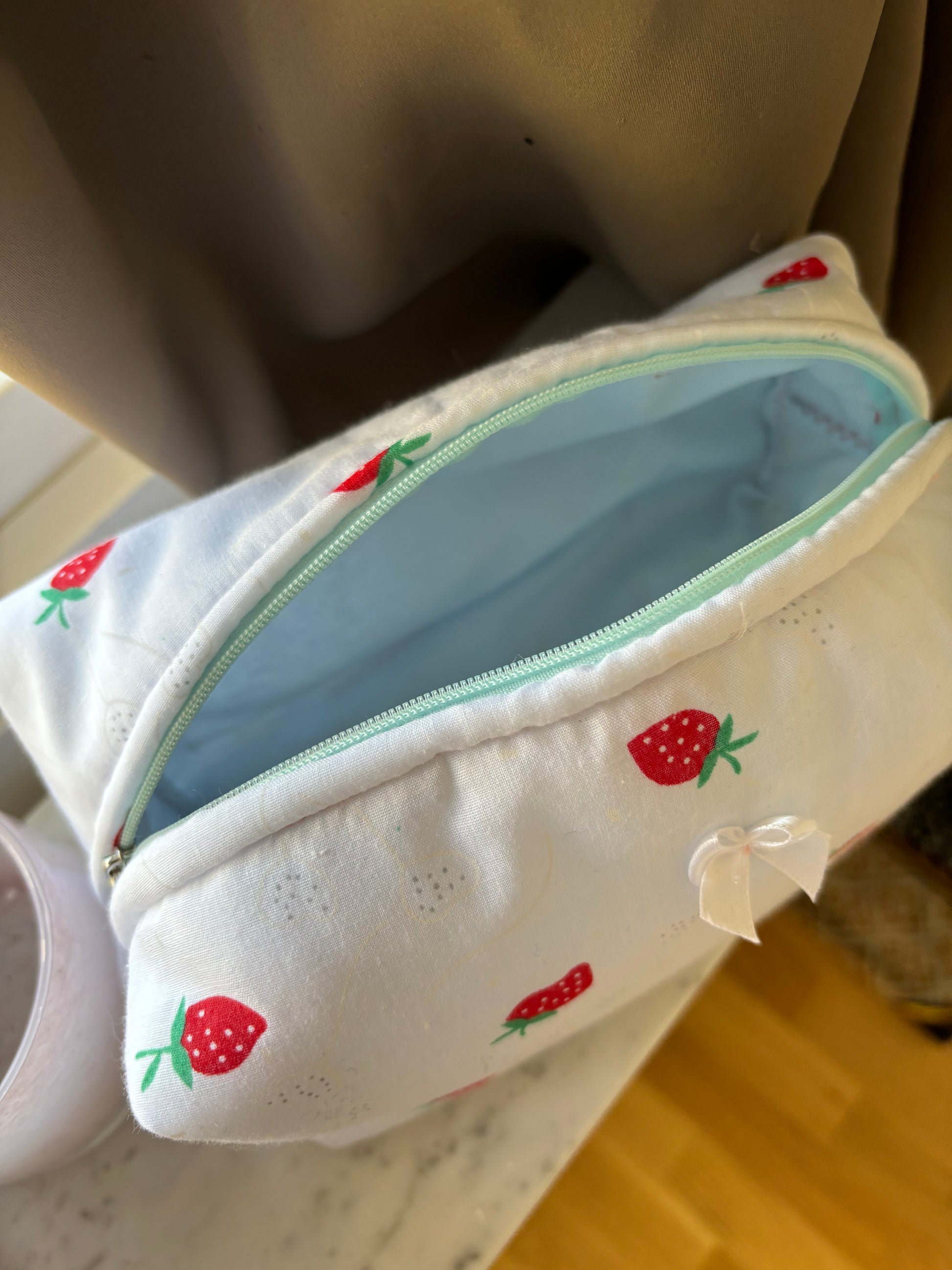 Strawberry är en somrig necessär med blått innertyg och blå dragkedja.